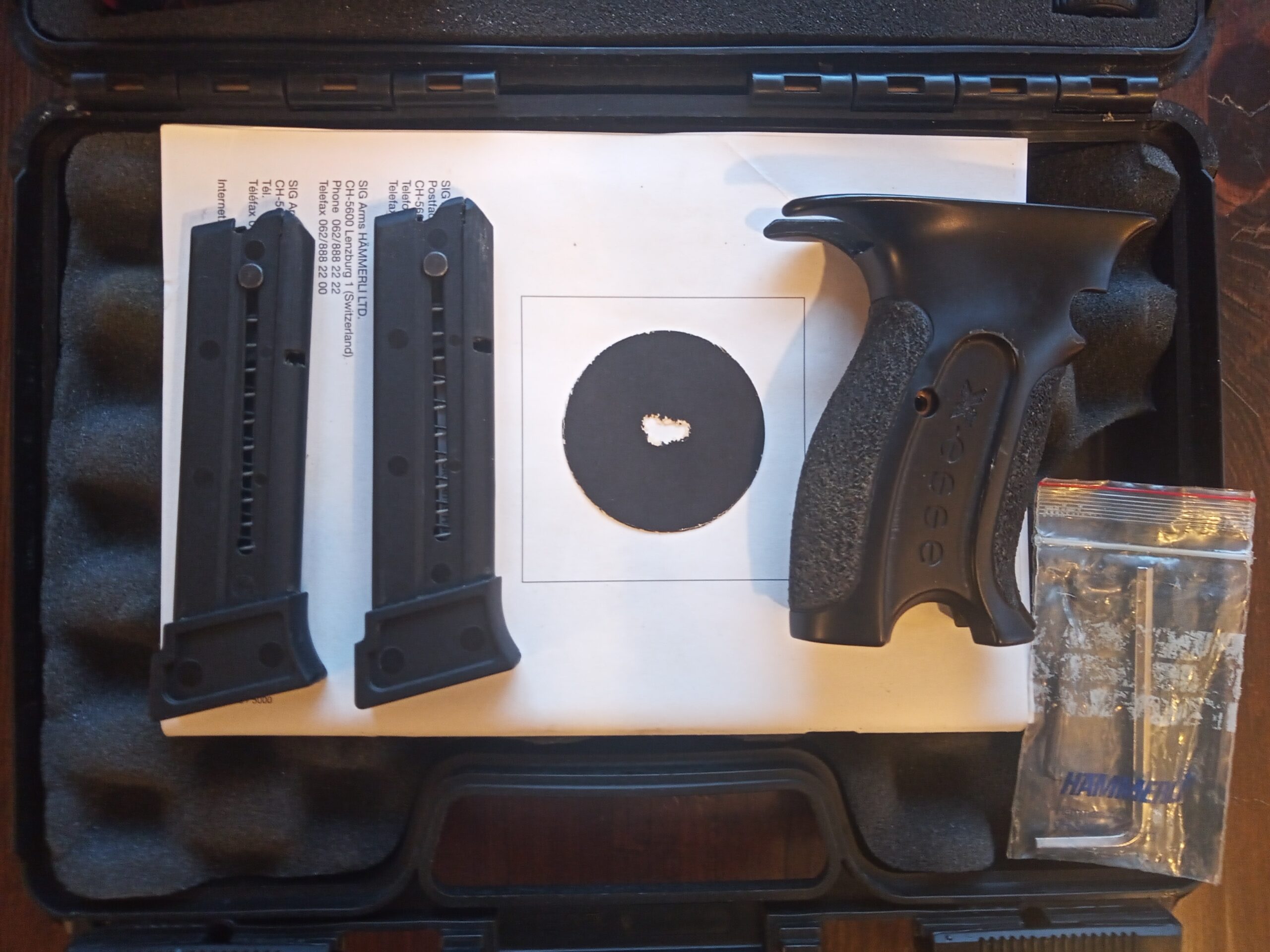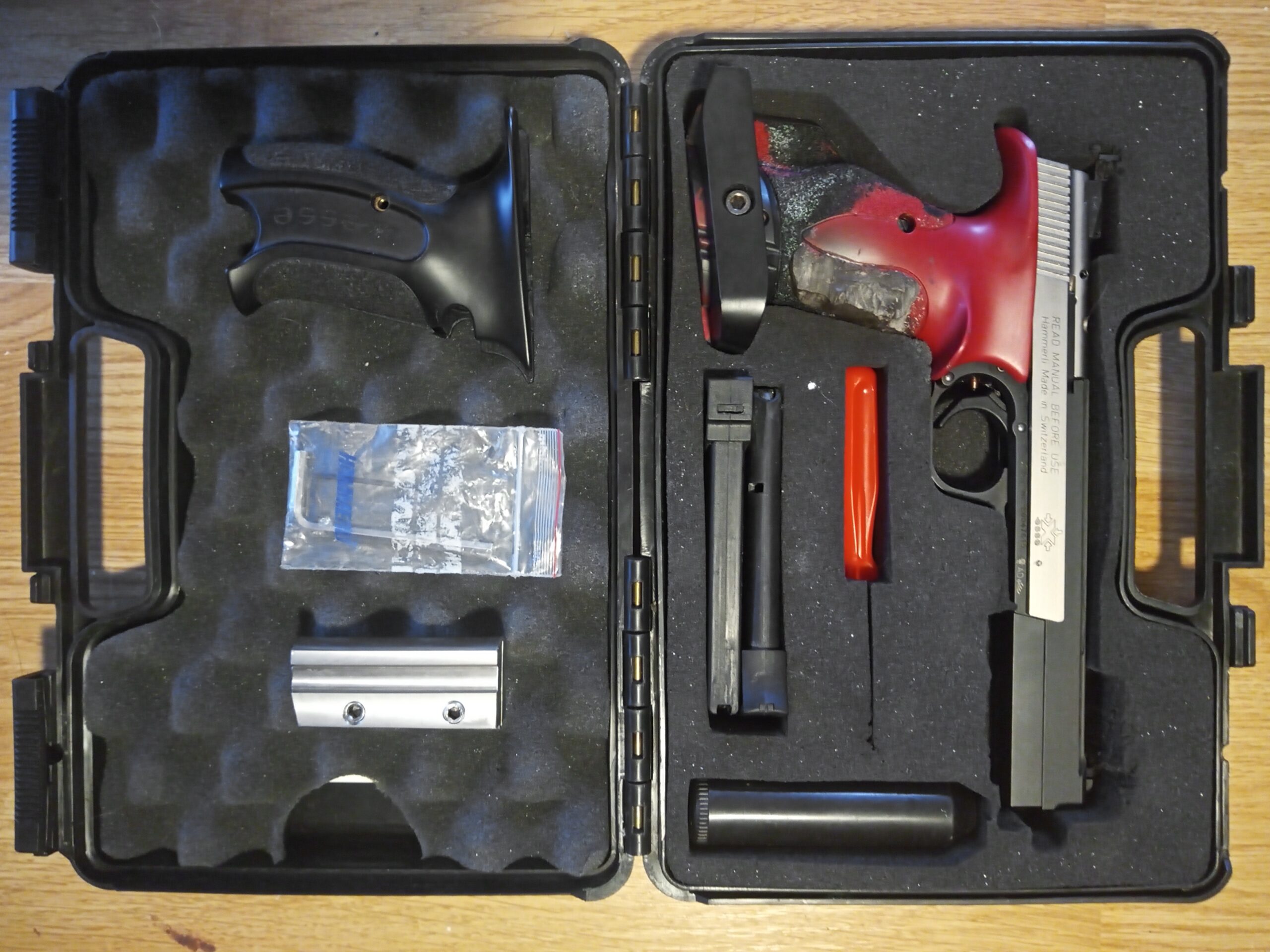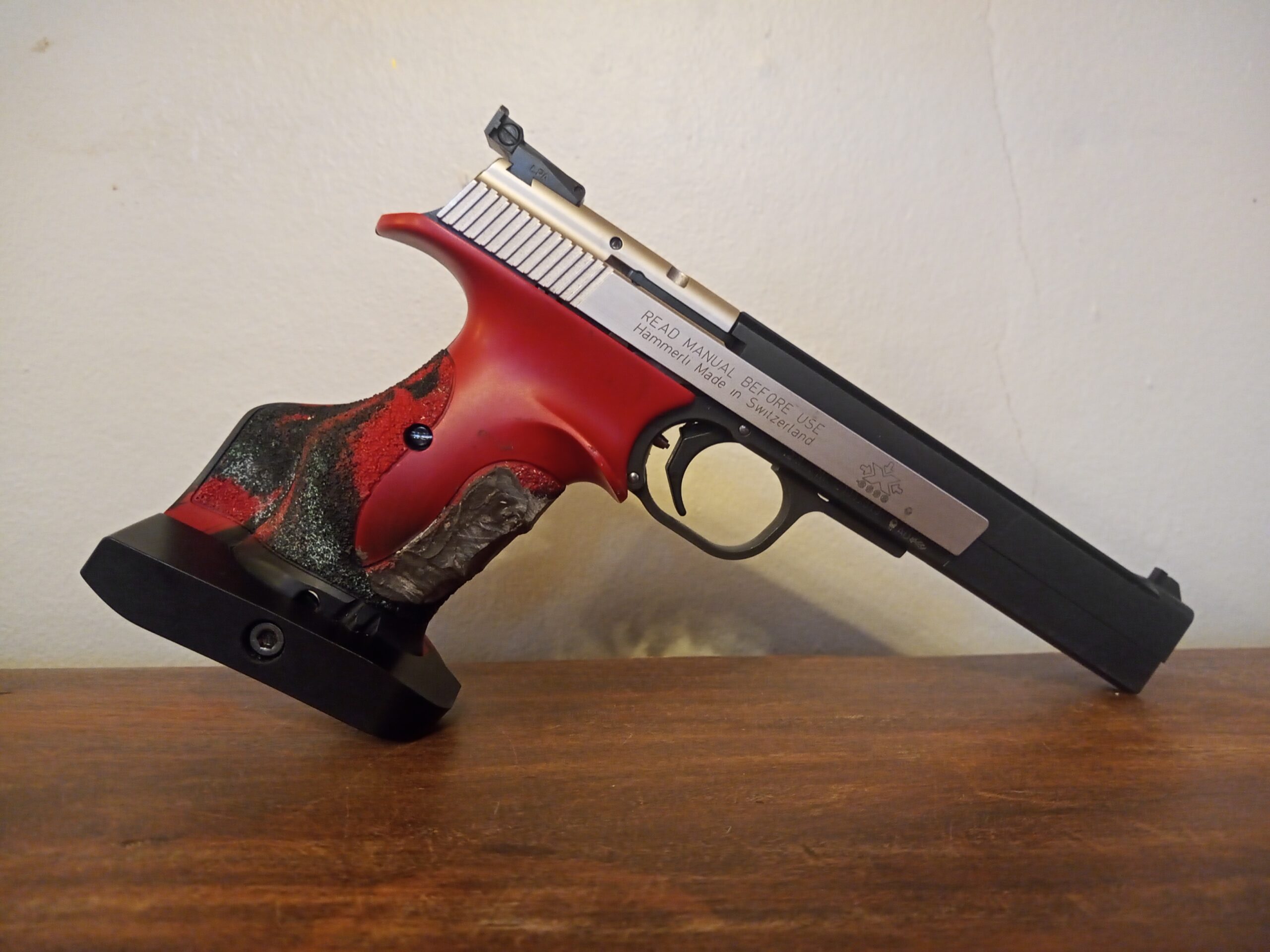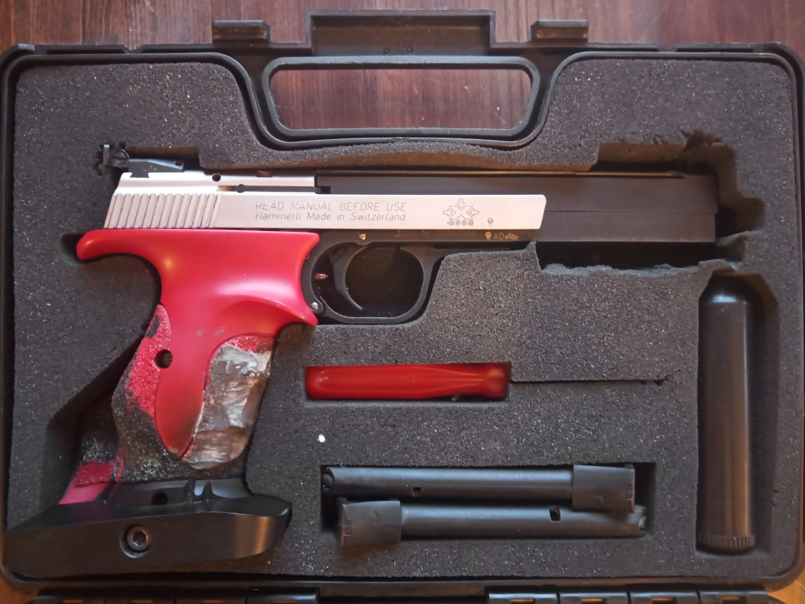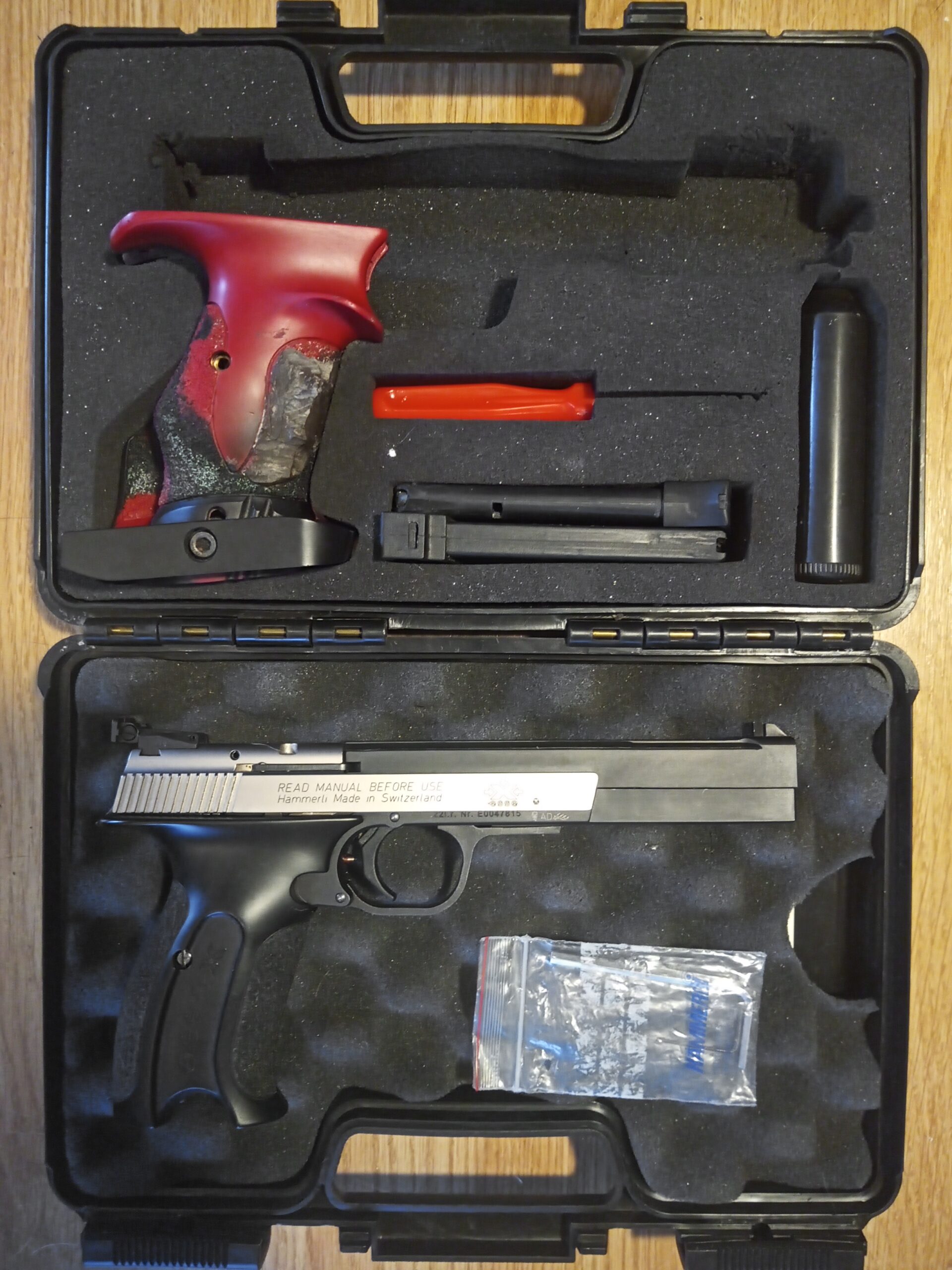 Hammerli Xesse skammbyssa í góðu standi. Með keppnisskepti og venjulegu, 2 stk. 10 skota magasín og auka 300 gr. þynging.