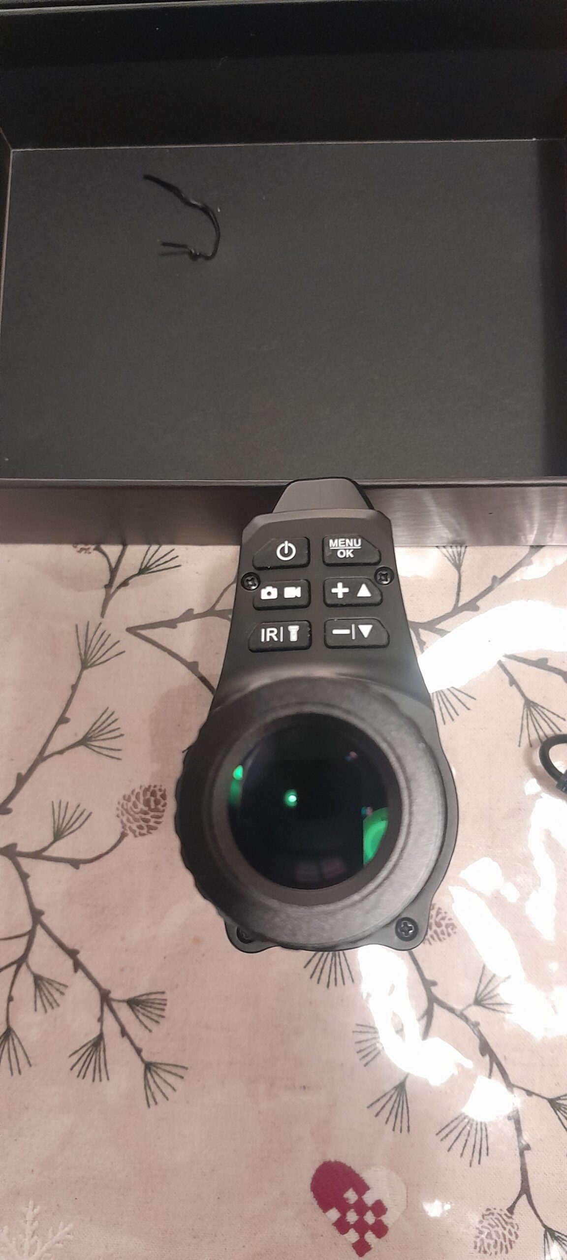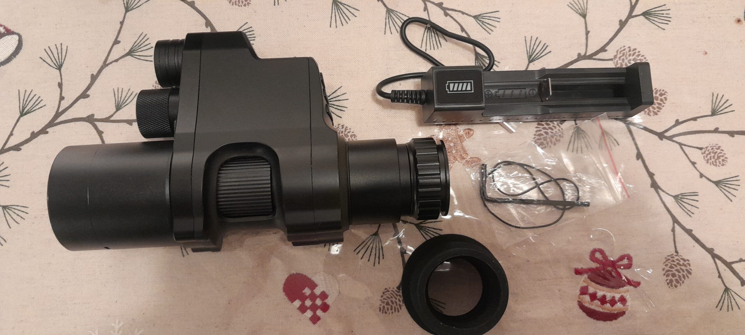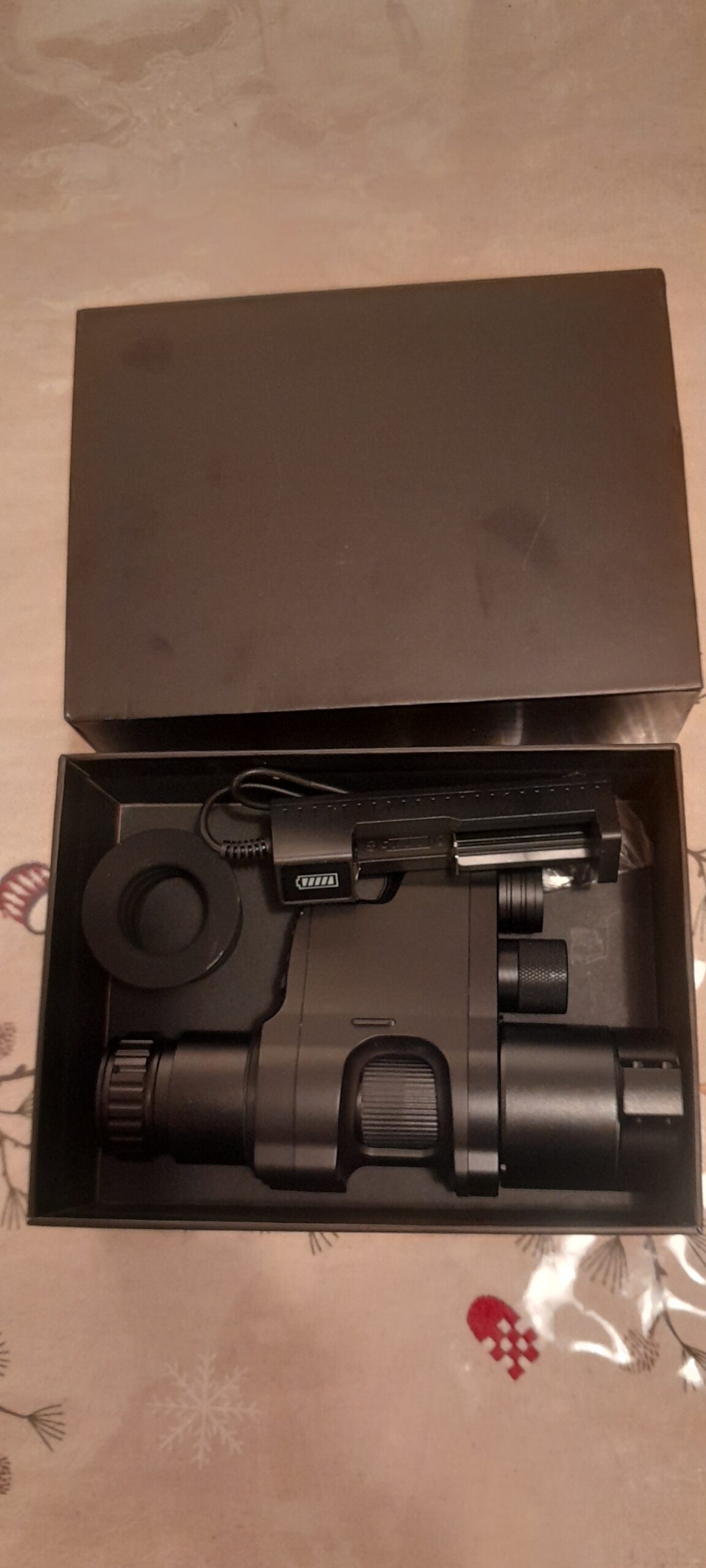 Dag/Nætursjónauki festur aftan á riffilsjónauka með möguleika á upptöku eða taka mynd. Hægt að nota sem handsjónauki en hentar betur á sjónauka. Hentar á færi allt að 300 metrum. Endurhlaðalegt battery, hleðslutæki, minniskort, þrælvirkar. Aðeins búið að máta og kveikja á. Aldrei farið í notkun.