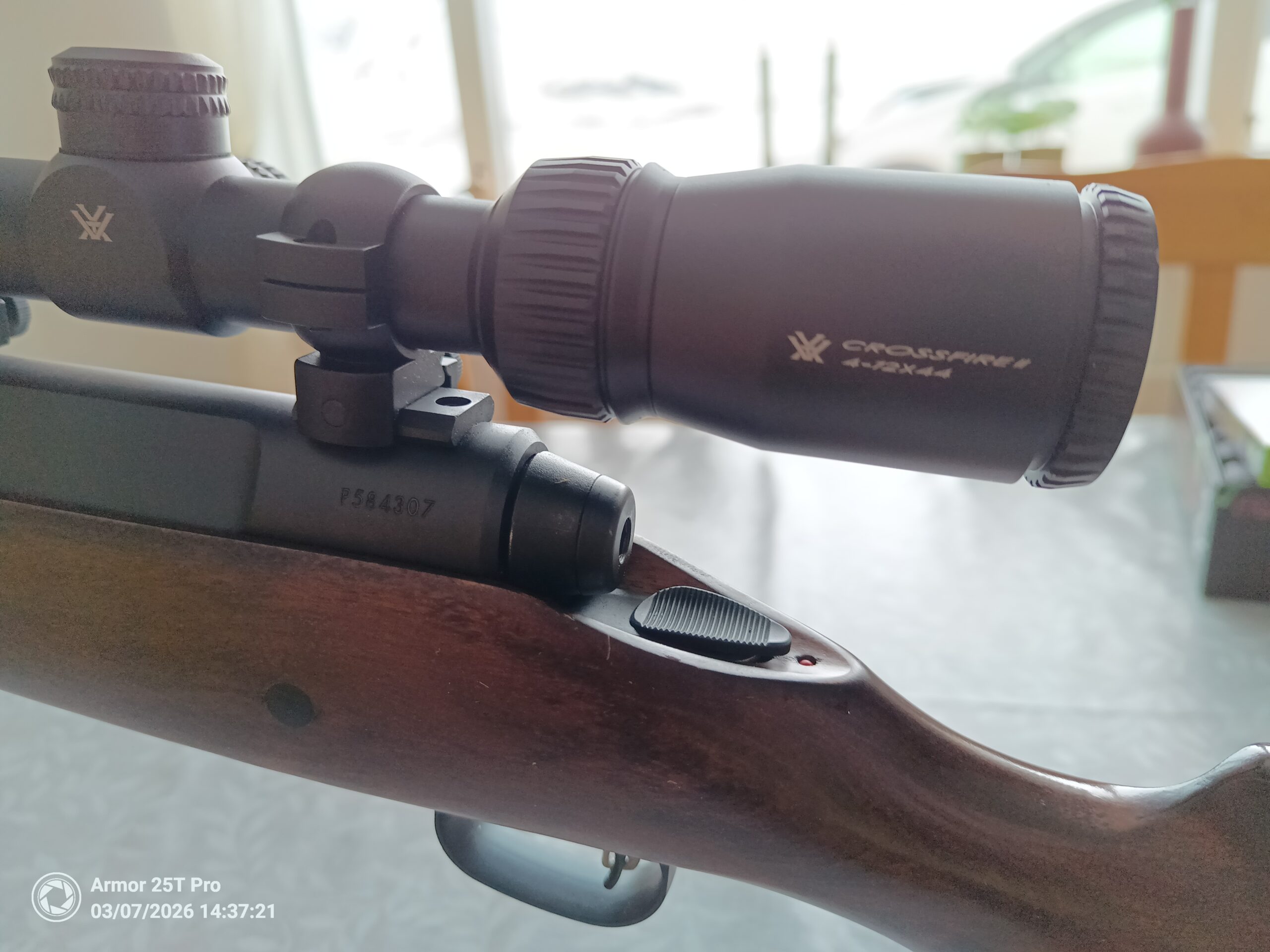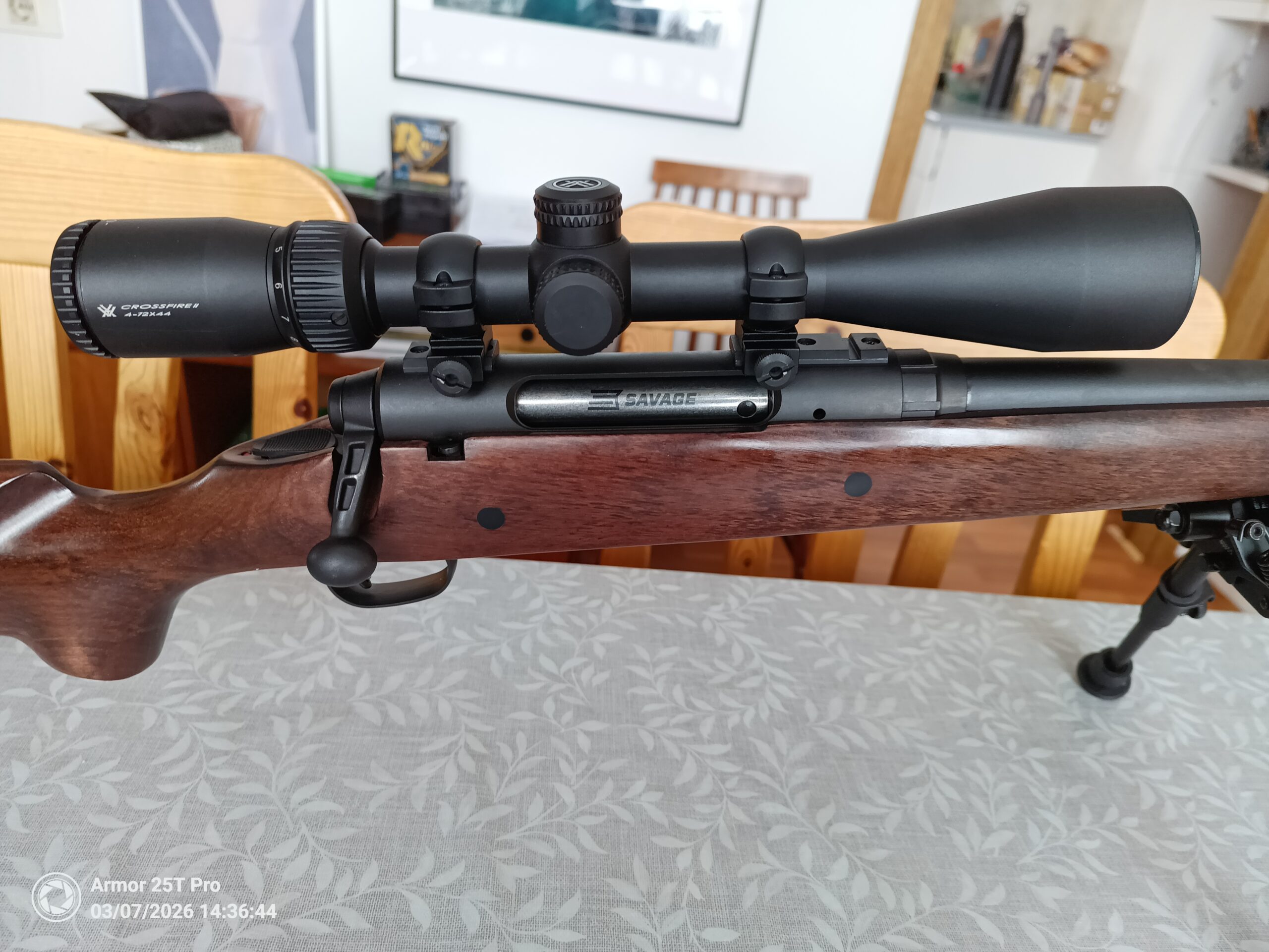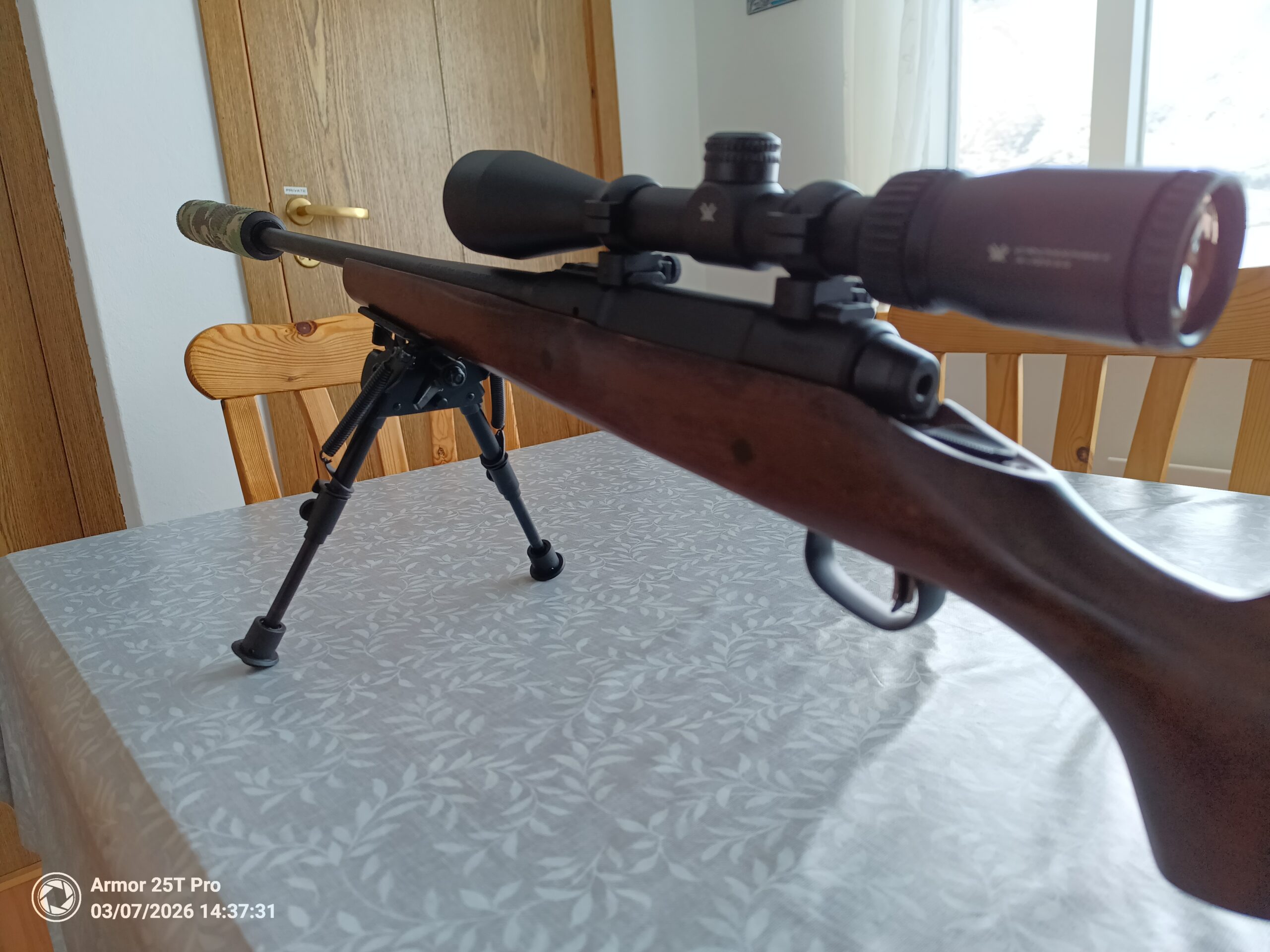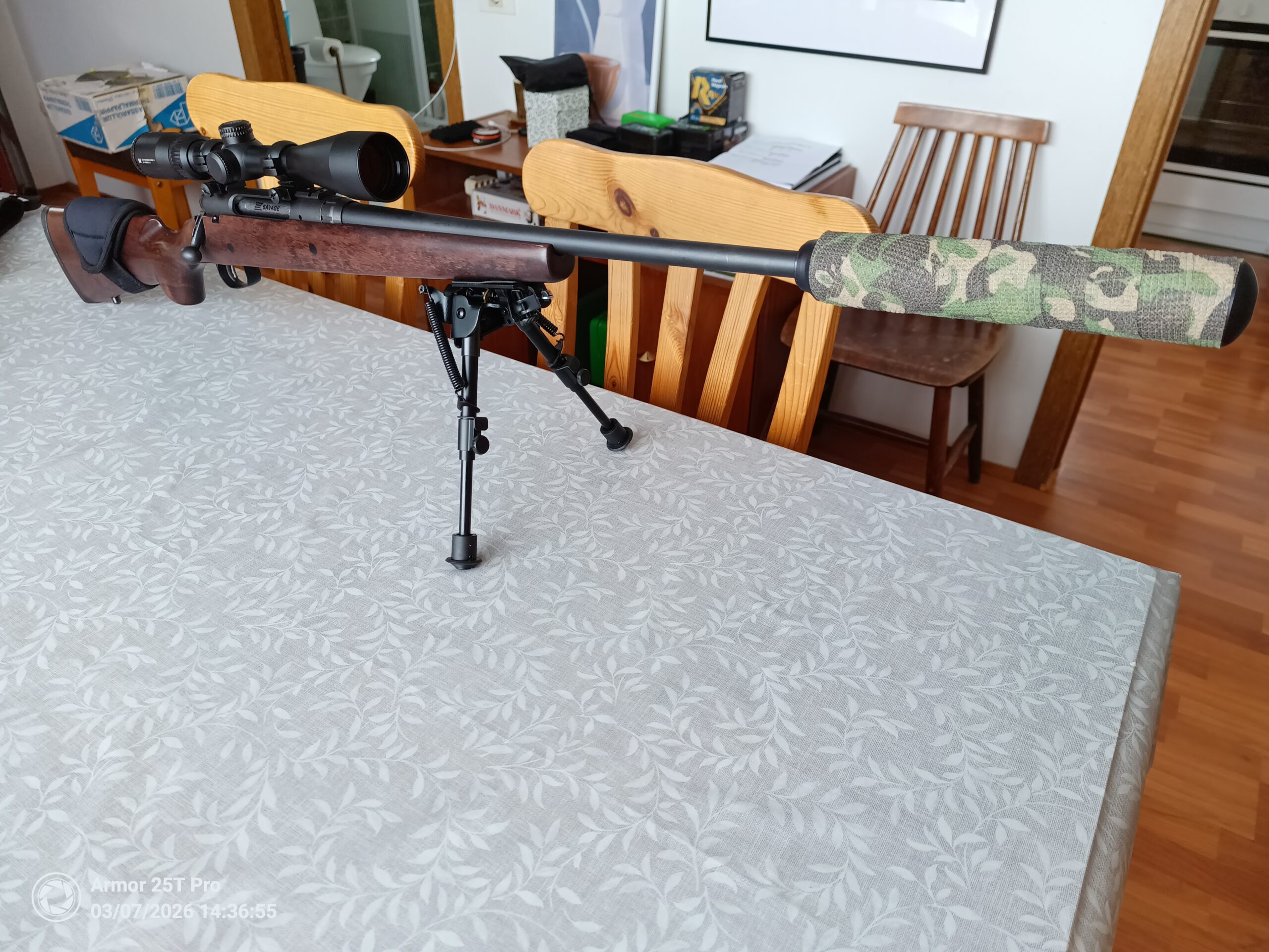 Tréskepti, 4 skota magasín, létt hlaup, snittaður fyrir deyfi, Nielsen Paradox deyfir, champion 6″-9″ tvífótur m/velti og Vortex Crossfire II 4-12×44 .